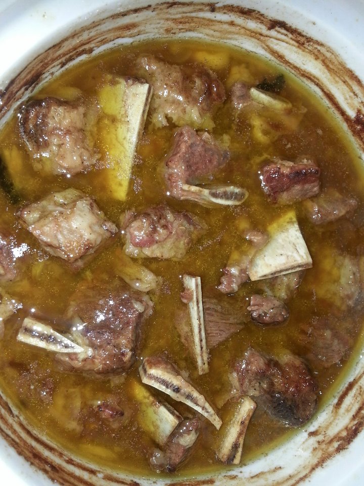 d. Once the ribs are brown, add water and the beef broth. Add also the onion and 2 cloves of garlic.