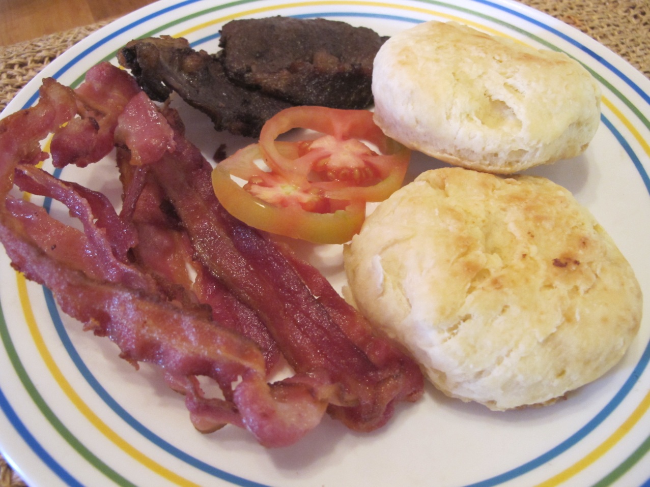 Biscuits with Bacon, Beef Sausage and Tomatoes. 🙂